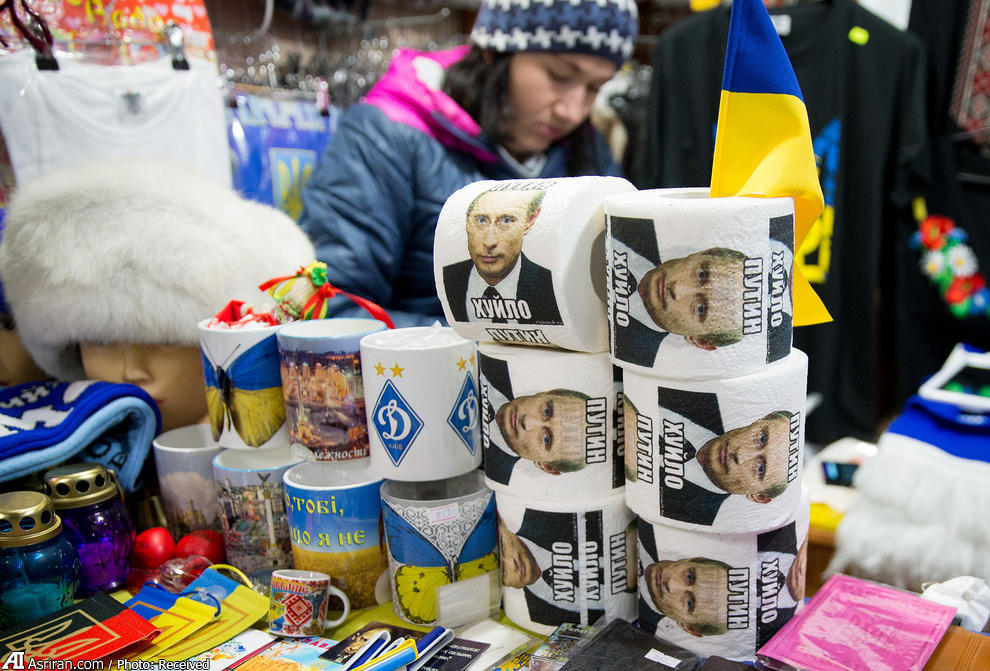 یک فروشگاه در میدان استقلال در شهر کی یف اوکراین دستمال توالت های منقوش به تصویر ولادیمیر پوتین رییس جمهور روسیه را می فروشد.