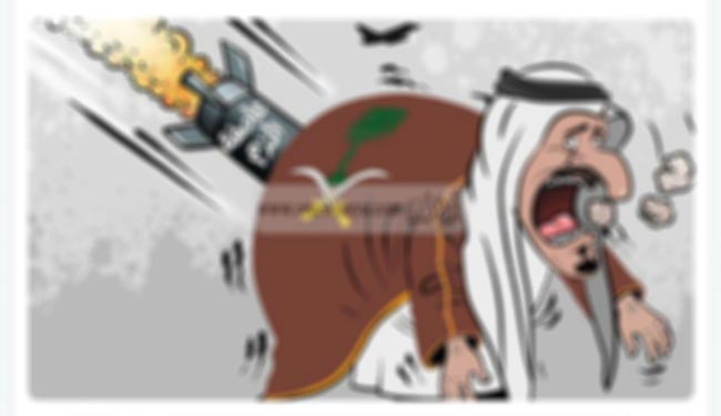 این تصویر کارتونی که پایگاه خبری “ام الدنیا” منتشر کرده است، ملک سلمان بن عبدالعزیز را در حالی نشان می دهد که موشکی با نام “عاصفه الحزم” (عنوان عملیات تجاوزکارانه عربستان در یمن) به پشت وی اصابت کرده و پادشاه را به گریه و زاری انداخته است.